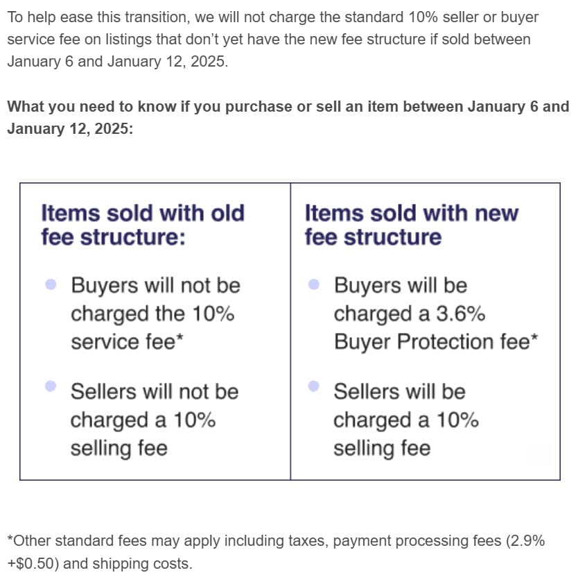 They're also providing a grace period between January 6th and 12th to allowed time for listings to be updated - listings that don't have the new structure will not apply the 10% fee on either side, though buyers will still pay other standard charges including taxes, payment processing fees (2.9% +$0.50) and shipping costs on those not yet updated items.