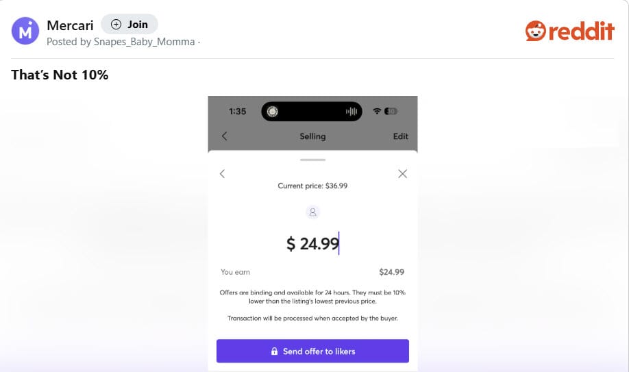 The recent Reddit post reveals while the offers screen still correctly tells sellers the minimum discount is 10%, the default suggested dollar amount automatically filled in by Mercari is much more than that - in this example $24.99 would be a ~32% discount from $36.99 and in their other example, $131 would be a ~27% discount from $179.99.