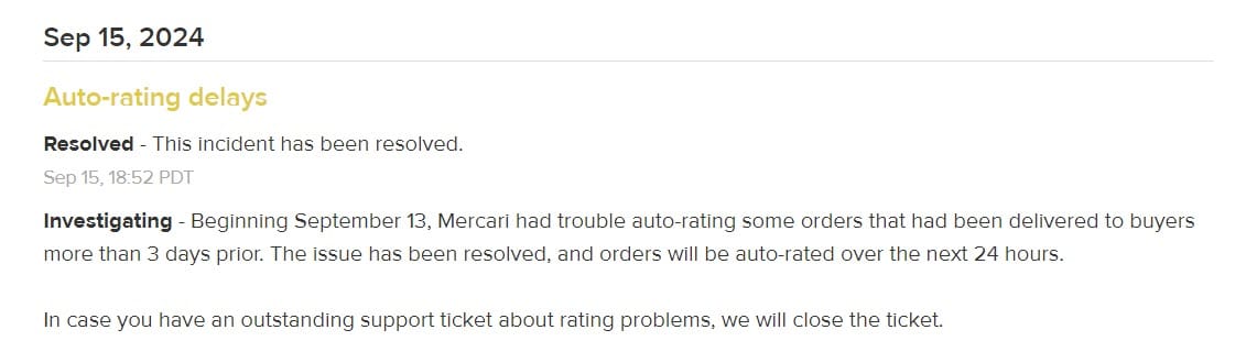 The Mercari Status Page acknowledged the incident, saying it was resolved on September 15th at 6:52 PM Pacific Time with orders missing auto-ratings receiving them over the "next 24 hours."