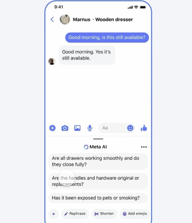When you start a chat with a seller, you’ll see a “Suggested questions to ask” button pop up. Tap it, and Meta AI will use the details from the listing and your conversation to suggest questions you might want to ask the seller.