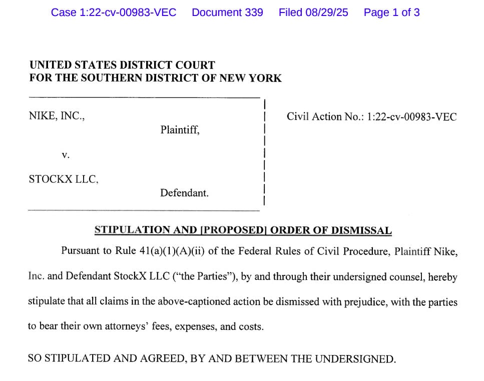 Nike and StockX have settled this case, with both sides responsible for paying their own attorney's fees, expenses and costs.