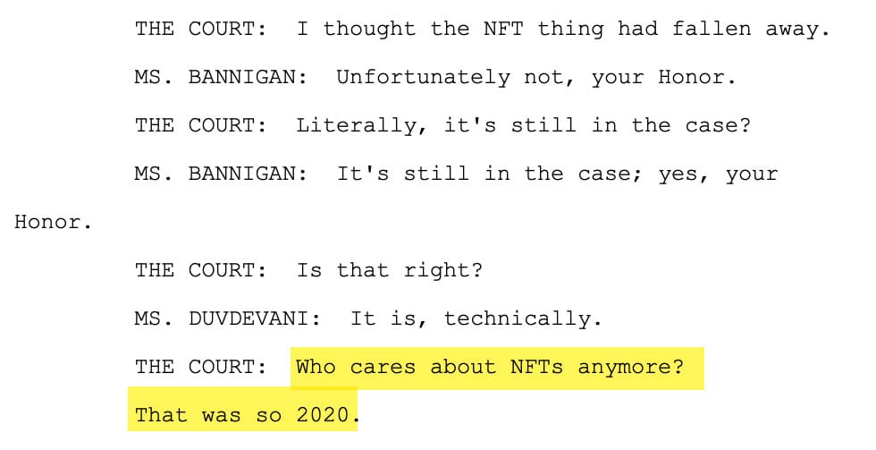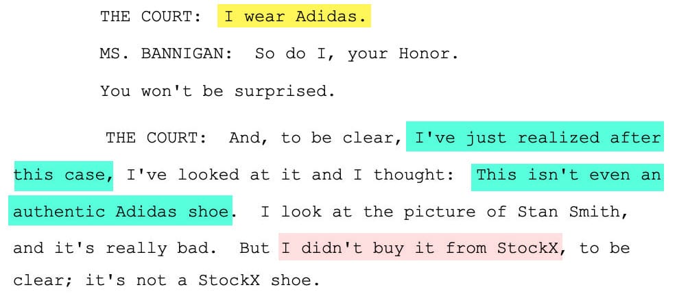 Twist from a recently available transcript in the Nike v. StockX: judge says NFTs are "so 2020" and that she wears Adidas. Fake ones. pic.twitter.com/NwWYhMOtgV
