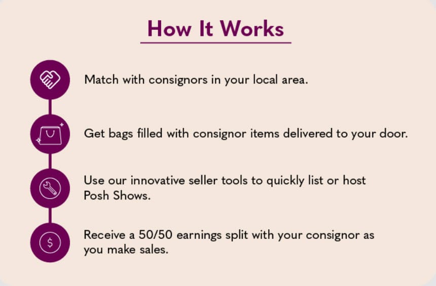 Poshmark is inviting sellers in select areas to apply as Poshmark Closet Partners, who will list and sell items provided by other Poshers (aka consignors). While in beta, Closet Partners will gain access to fresh merchandise to grow their business and help shape the future of this network.