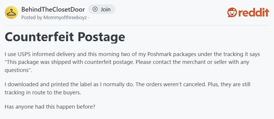 Poshmark users are confused and frustrated as apparent USPS glitch is causing past orders to appear in Informed Delivery summaries with erroneous counterfeit postage warnings.