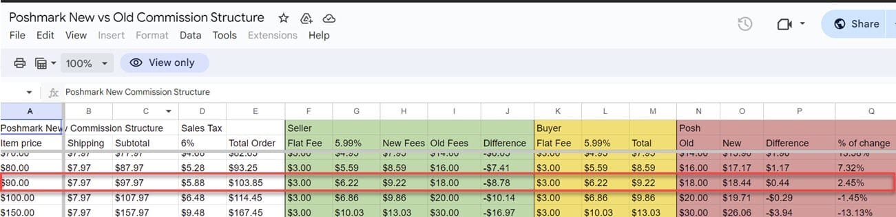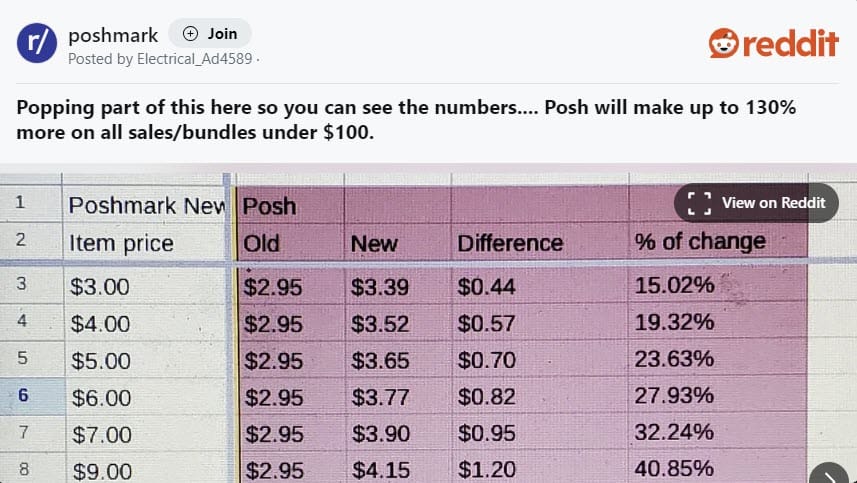 One very helpful seller on Reddit did their best to help fellow Poshers estimate the new fee breakdown with a spreadsheet breakdown assuming an average 6% in sales tax and $7.97 shipping.