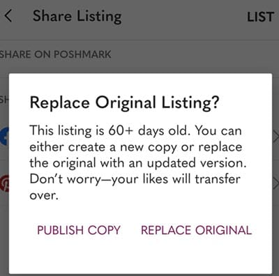 - If the listing is 60 days or older, choose to Publish Copy or Replace Original (to move Likes)