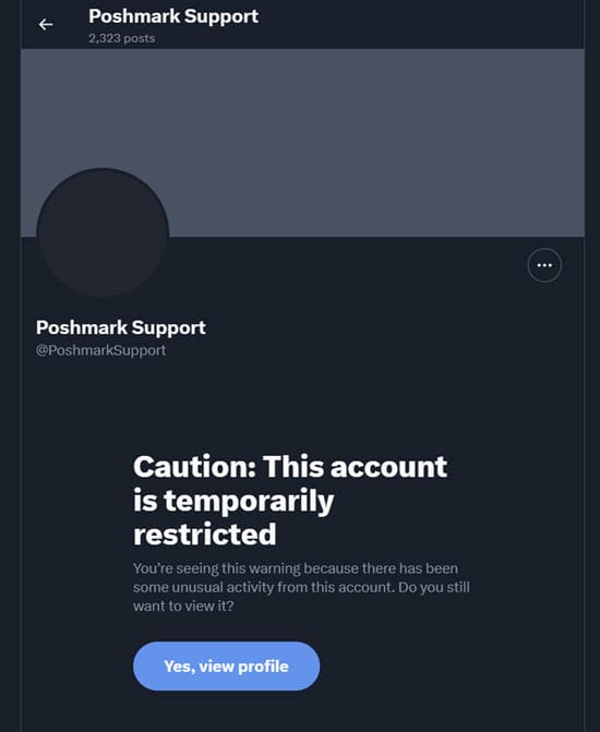 Despite the assurances that accounts are safe and protected, it's very concerning that Poshmark's official support handle on Twitter/X is also showing a warning stating it has been temporarily restricted due to "unusual activity".