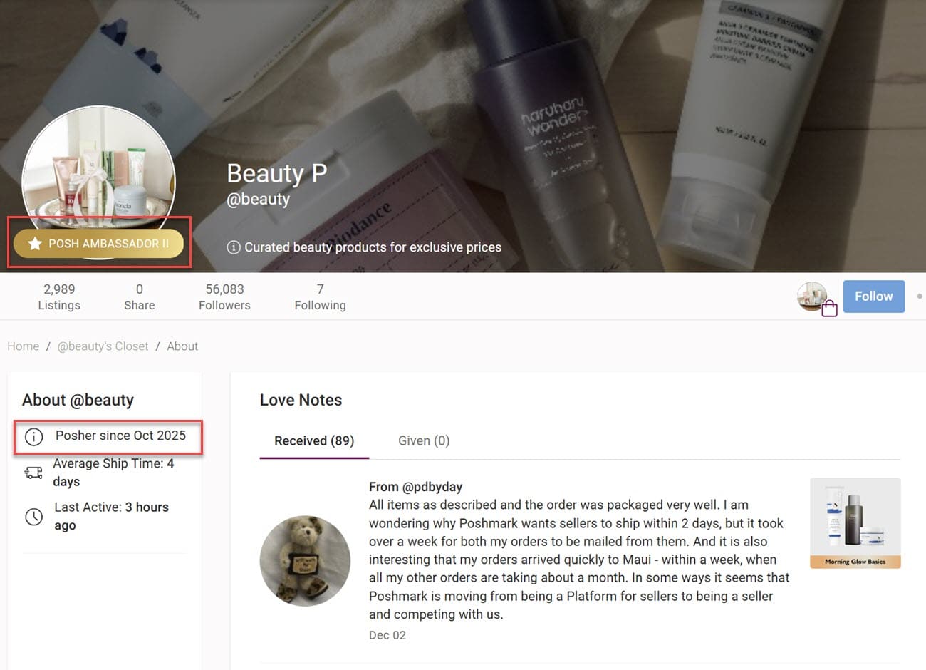 Savvy-sellers on Reddit noticed a curious detail about the Poshmark Beauty account, which has been granted Posh Ambassador II status despite only be 2 months old - a designation regular sellers would have to wait at least 6 months and jump through qualifying hoops for.