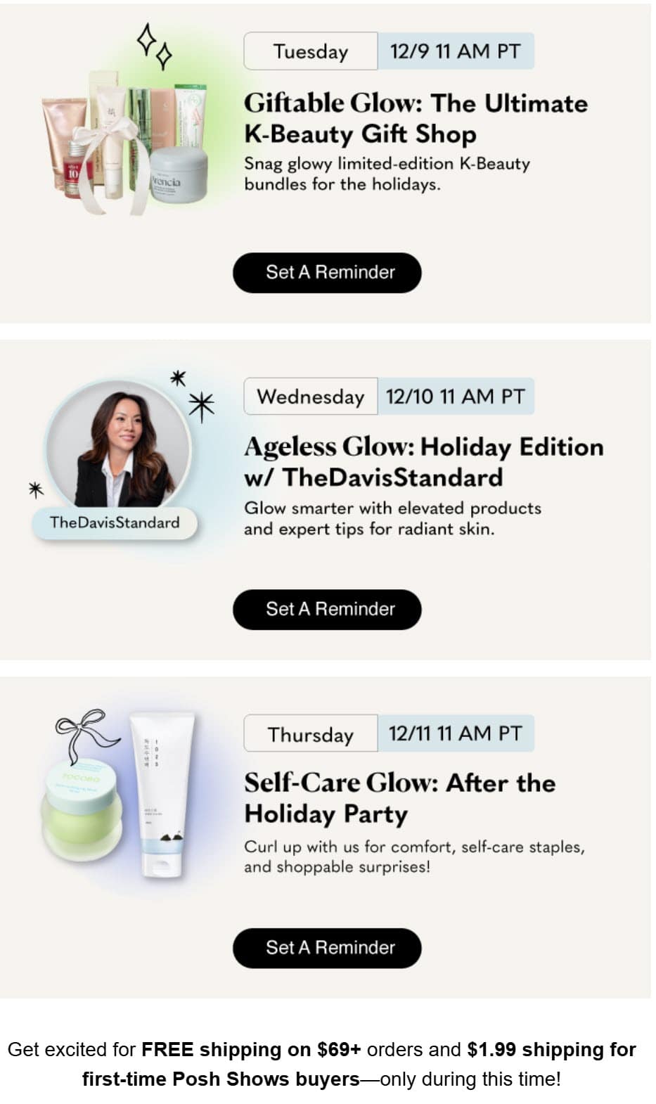 After a recent Poshmark-hosted live partnership with Quince sparked significant seller backlash, the company appears to be doubling down on the practice with multiple shows this week featuring Korean beauty gifts for the holidays - sold directly from the official Poshmark @beauty account.