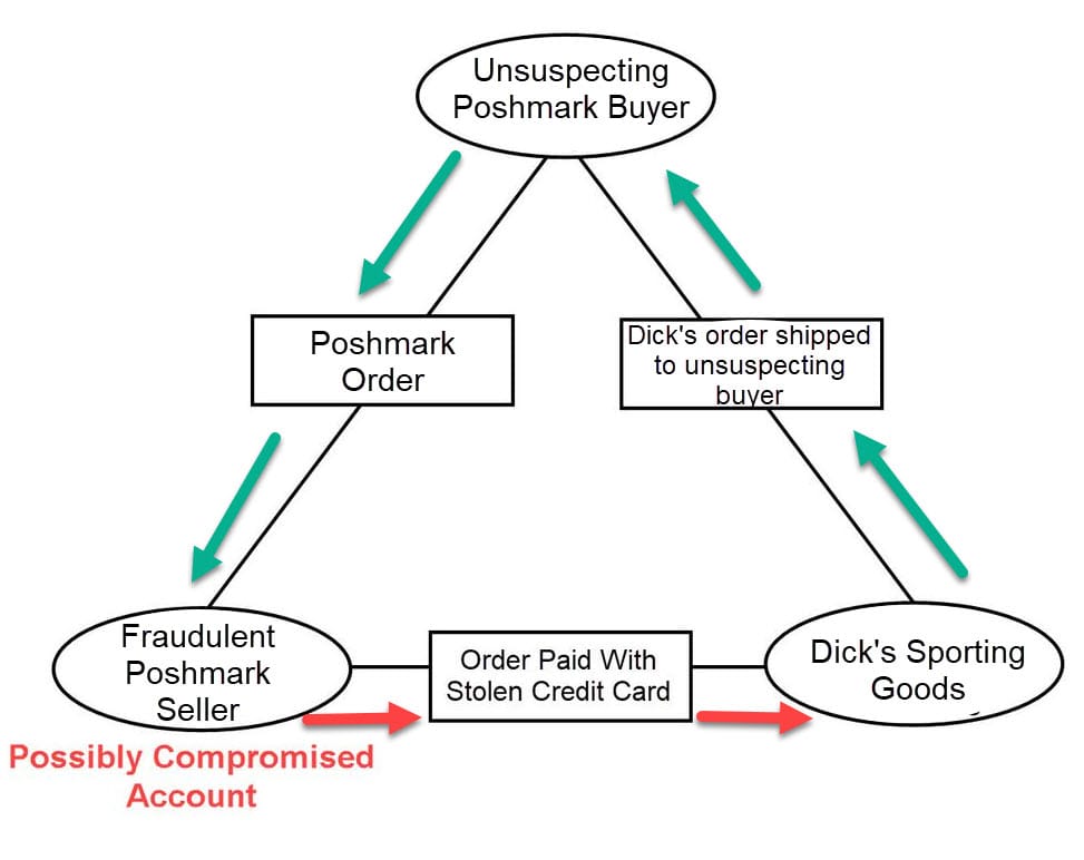 One might think that Poshmark's shipping policies would help prevent this fraud - since they provide a pre-paid shipping label to the seller and there would be no way for the fraudulent seller to have Dick's Sporting Good's use that Poshmark provided label to ship to the Poshmark buyer.