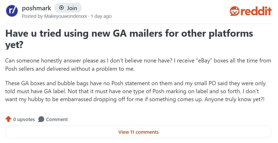 But sellers who jumped on the offer are finally starting to receive their supplies and have noted that there is no explicit Poshmark branding to be found - leading to questions about whether or not they can use this packaging for any of their USPS Ground Advantage shipments, even if they are orders from eBay, Mercari or other competing marketplaces.