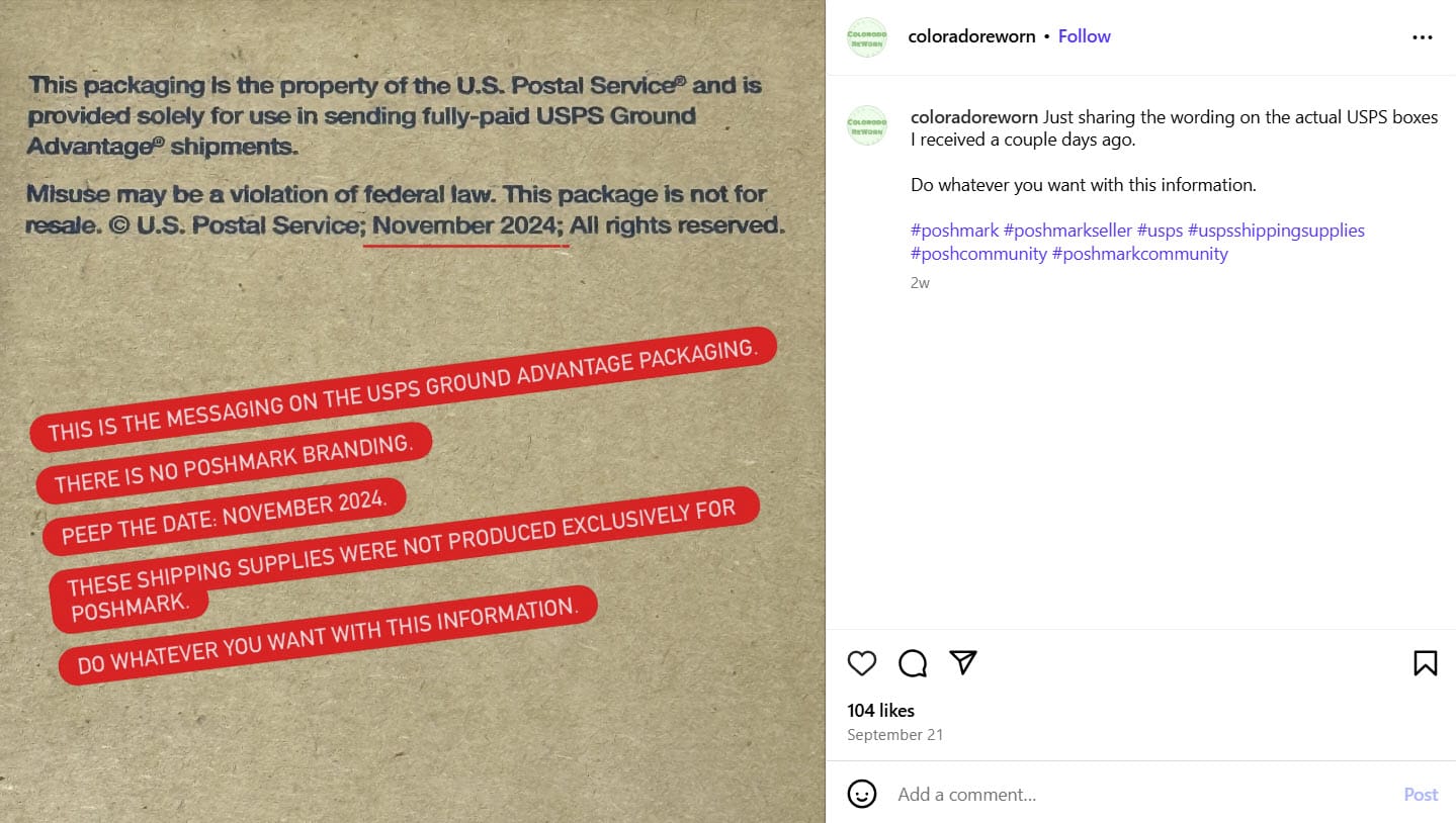 As Liz O'Kane of Colorado Reworn points out on Instagram, the packaging simply says that it must be used for fully-paid USPS Ground Advantage shipments only, with no mention of Poshmark, and the copyright date stamped on the packaging is from November 2024, which predates the Poshmark deal by almost a year.