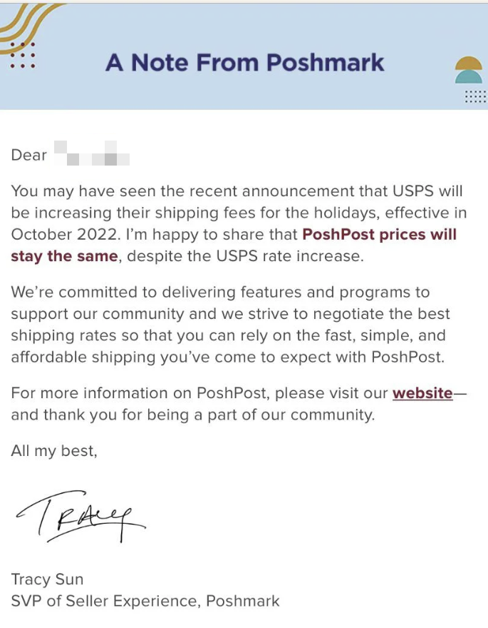 Poshmark is reaching out to sellers to let them know despite USPS increasing rates during the peak holiday season, PoshPost shipping prices will remain the same.