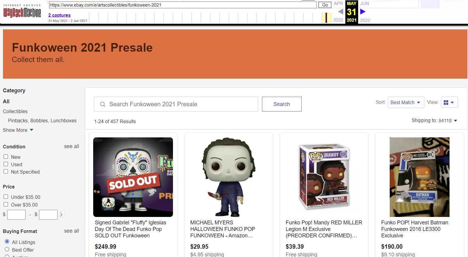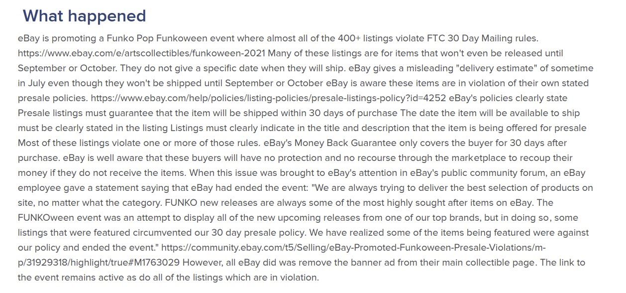 For example, here's the saved version of the Funkoween 2021 event where eBay was promoting presale listings in violation of their policies and FTC regulations.
