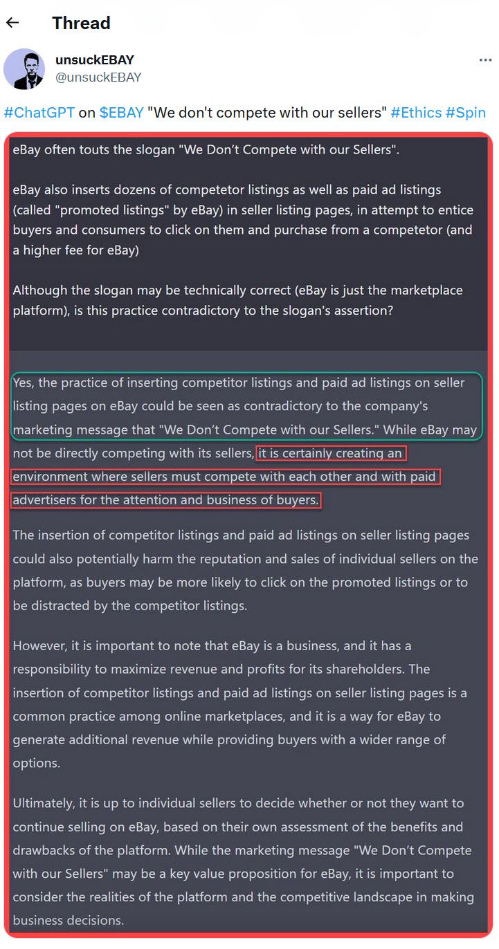 Apparently even ChatGPT finds eBay's ad practices to be contradiction to their "we don't complete with sellers" statements. 😉