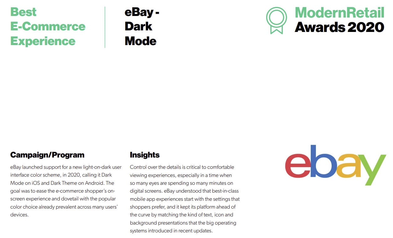 Unfortunately, 4 years later, eBay still hasn't figured out how to extend the magical dark experience to their desktop web design - despite it being a very often requested user experience enhancement.