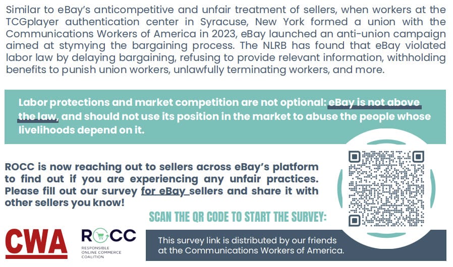 TCGPlayer sellers represented by ROCC raised several important concerns in their FTC petition, including the allegation that they experienced retaliatory actions against their accounts due to their public support and solidarity with the historic first union in eBay's history established by TCGPlayer authentication workers last year.