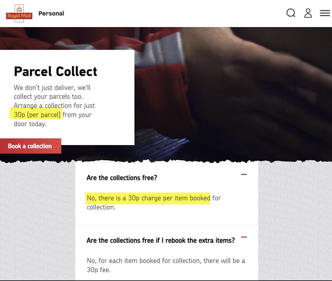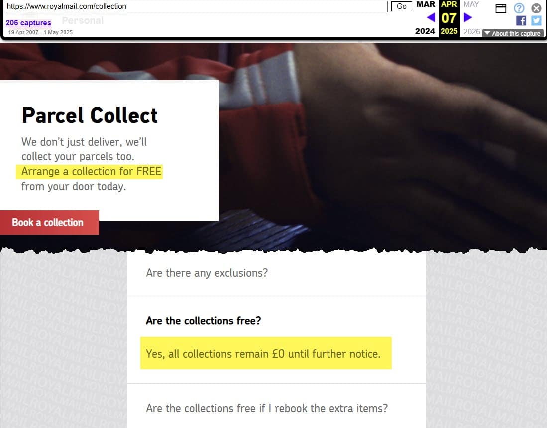 The Internet Archive Wayback Machine shows as recently as April 7, 2025, Royal Mail still showed collection service was free.