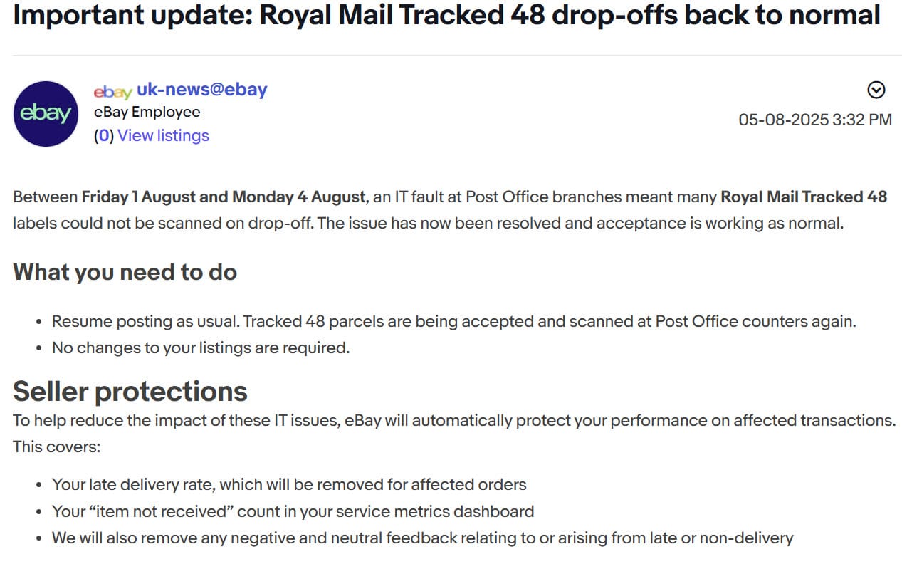 Sellers also report being told by eBay support that they will be protected from any late shipping defects which may occur due to this Royal Mail problem, but so far there has been no public acknowledged of the issue, let alone confirmation that seller protections will be applied.