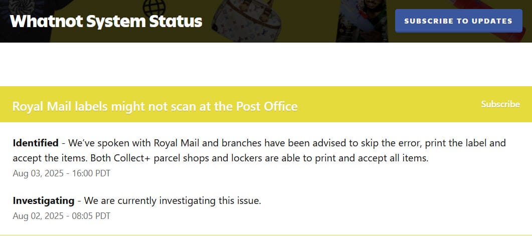 Whatnot also confirms that Royal Mail has advised all branches to skip the error and accept packages any way.