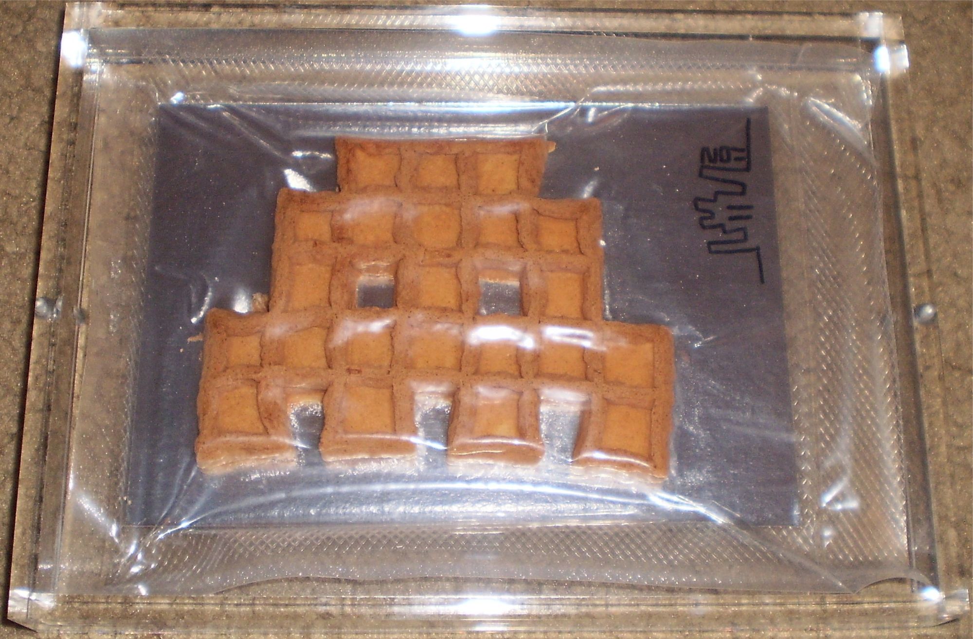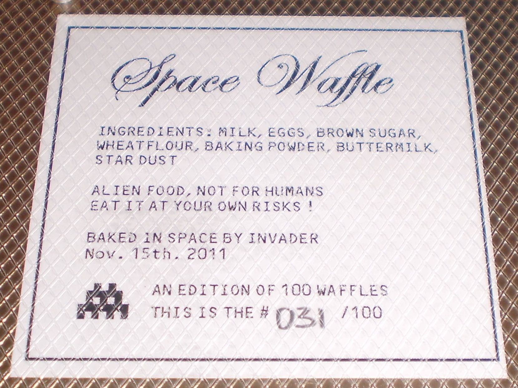 Invader is known for public installations of tile mosaics that form pixelated images, often of the alien creatures from the classic arcade game "Space Invaders." He also makes prints of similar pixelated images that are highly collectible. The "Space Waffle" was an actual waffle that was vacuum sealed and enclosed in a clear display box. The waffle was shaped like one of the artist's signature pixelated aliens and the squares on the waffle replaced the tiles for the pixelated-type look. It was also signed and numbered by the artist, just like an art print would be!