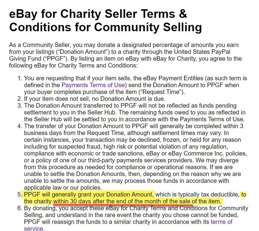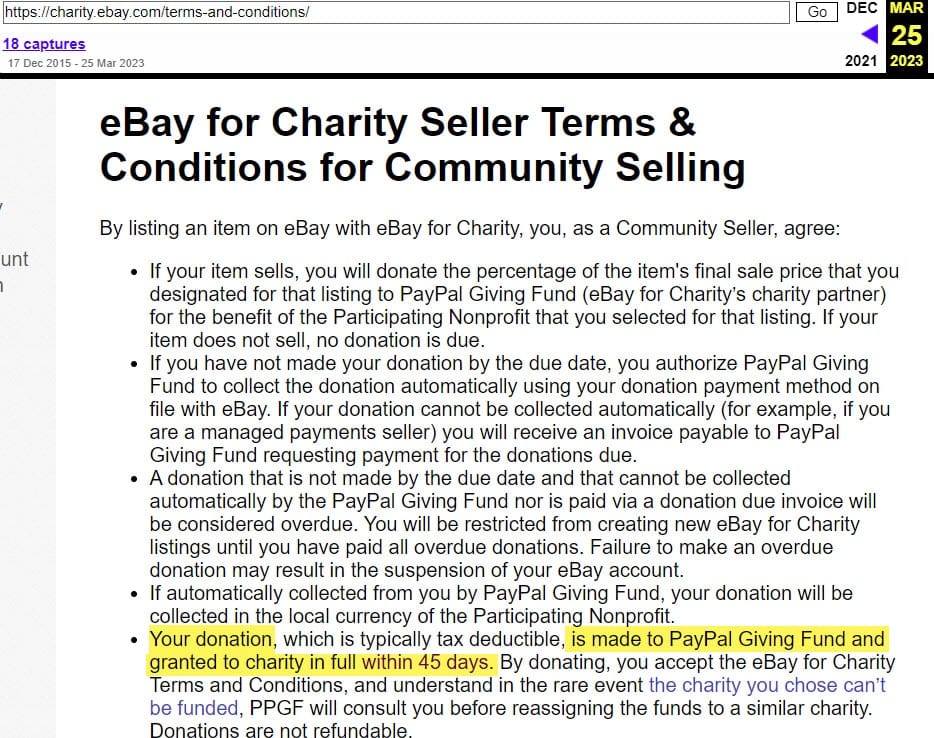 Now, 21 days after the first "automatic deduction" of an 8 March charity sale, my charity still has not gotten the funds and I have no record of the charity sale other than what's buried in ebay reports. Where does the money go? Drilling down in ebay on that item sale, I see a "donation transmission receipt" that says the funds were sent to PayPal Giving Fund the same day of the sale. Weeks ago. So where is the money today? My charity did not get it. Who did?