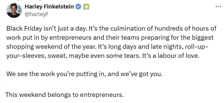 Ahead of the busiest shopping day of the year for many merchants, Shopify President Harley Finkelstein shared a message of support and solidarity on X - telling the entrepreneurial heroes of Black Friday weekend they've got this, and Shopify has them.