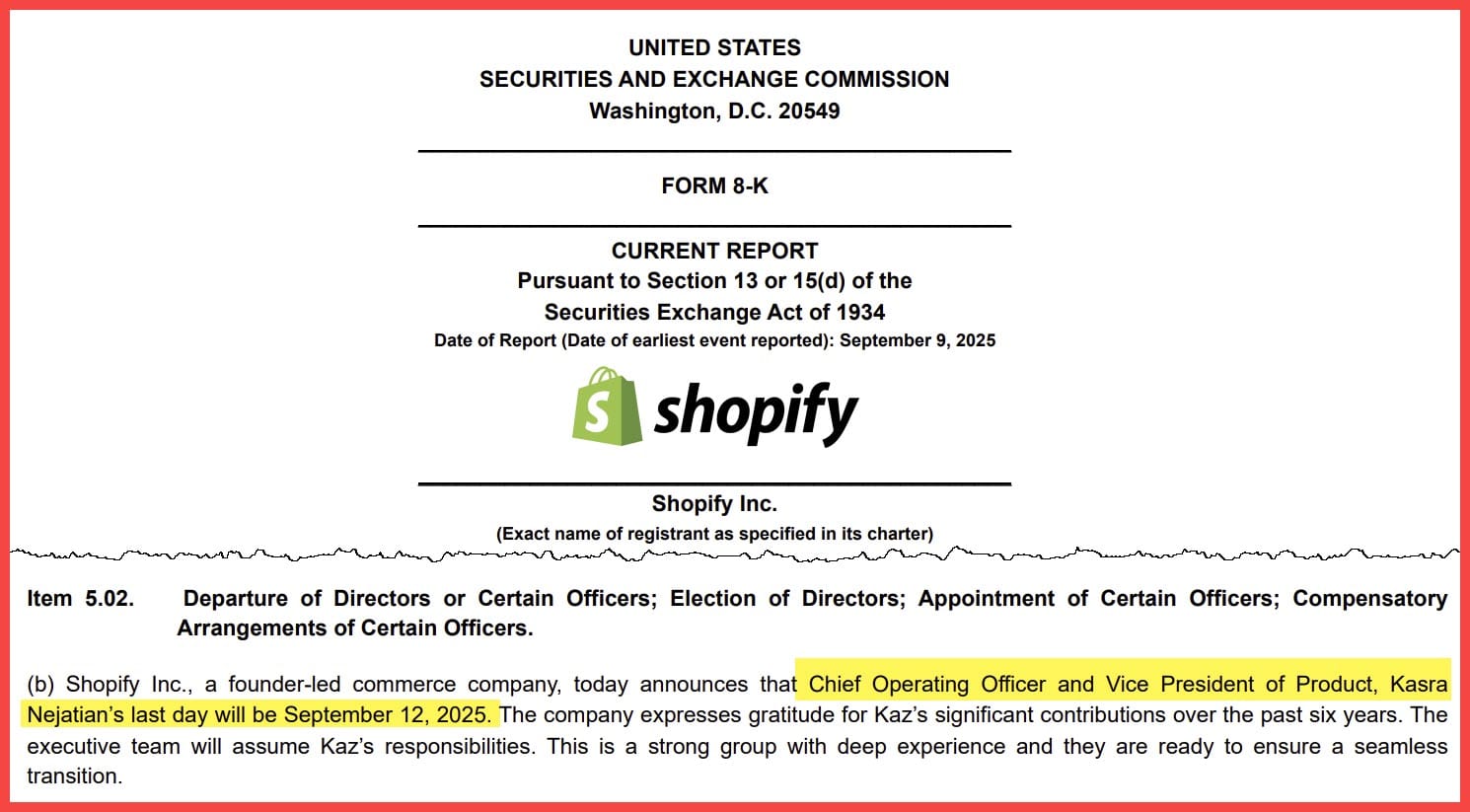 Shopify Chief Operating Officer VP Product, Kaz Nejatian is stepping down on September 12 to take on a new leadership role as CEO of AI-powered real estate platform Opendoor.