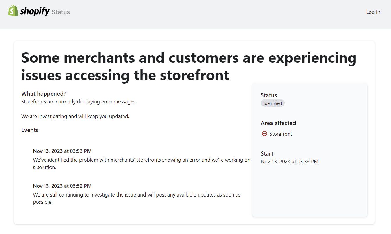 We’ve identified the problem with merchants' storefronts showing an error and we’re working on a solution.Nov 13, 2023 at 03:52 PM