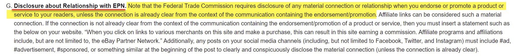 eBay has been leaning heavily on the EPN affiliate program lately as an alternative to the as yet to be seen but theoretically coming soon social sharing incentive program and the FTC has been closely scrutinizing "truth in advertising" especially involving endorsements and promotions with stiff fines and penalties for non-compliance.