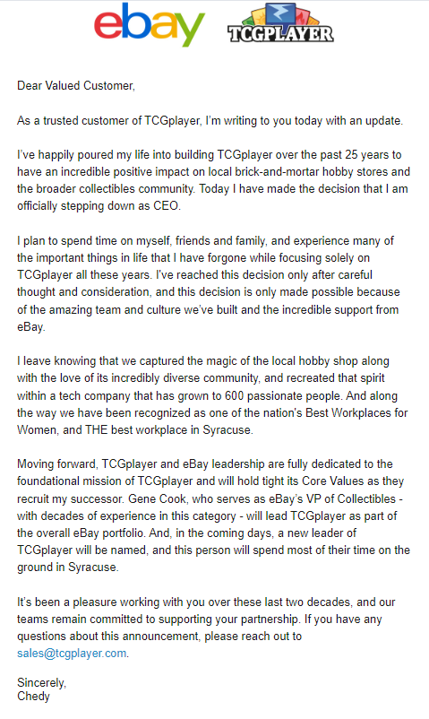 Chedy Hampson steps down from his role as CEO at TCGPlayer - Email sent to TCGPlayer customers from magicTCG