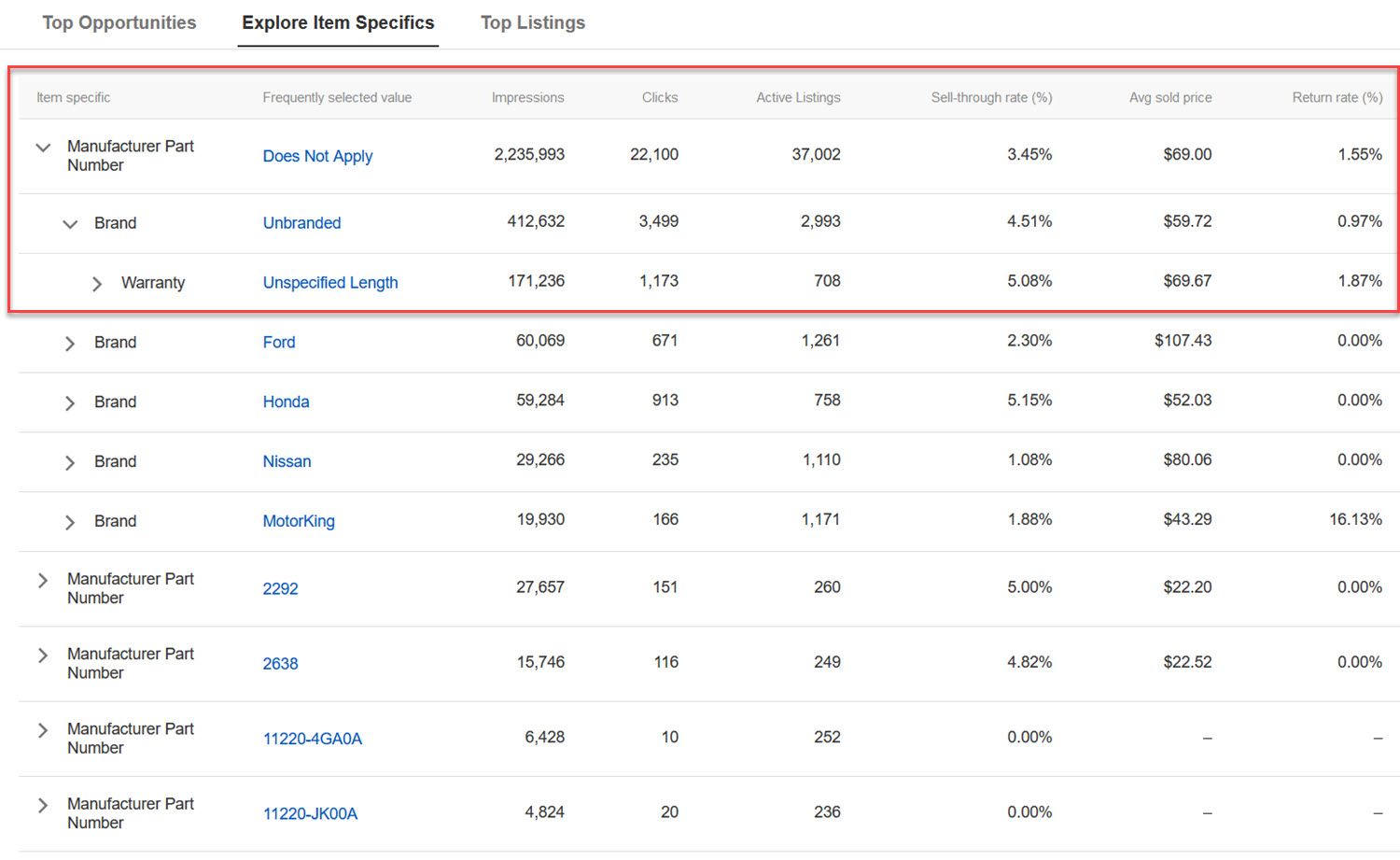 If you jump to the Explore Item Specifics tab you can see that the vast majority of listings have Does Not Apply, Unbranded, or Unspecified.