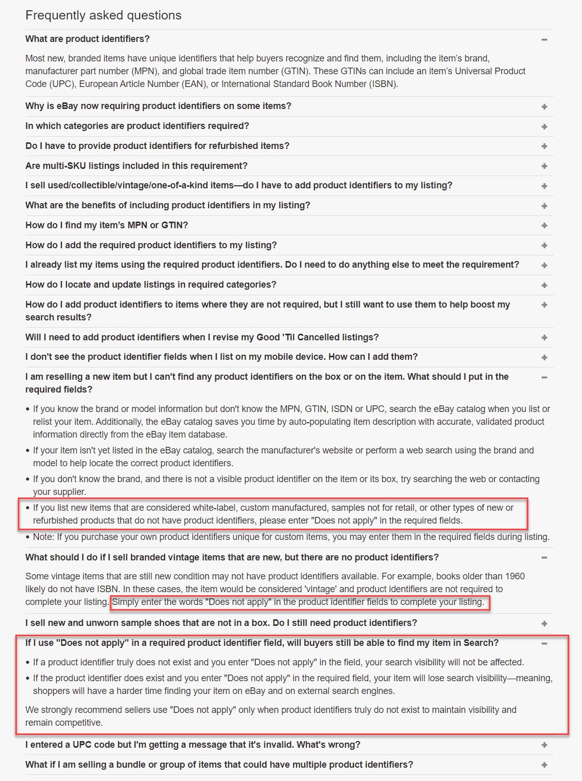 Since leaving these fields blank was not allowed, what were sellers supposed to do in instances where there was no Brand, MPN, or UPC available? eBay's official advice was to simply enter "Does Not Apply" in those cases.