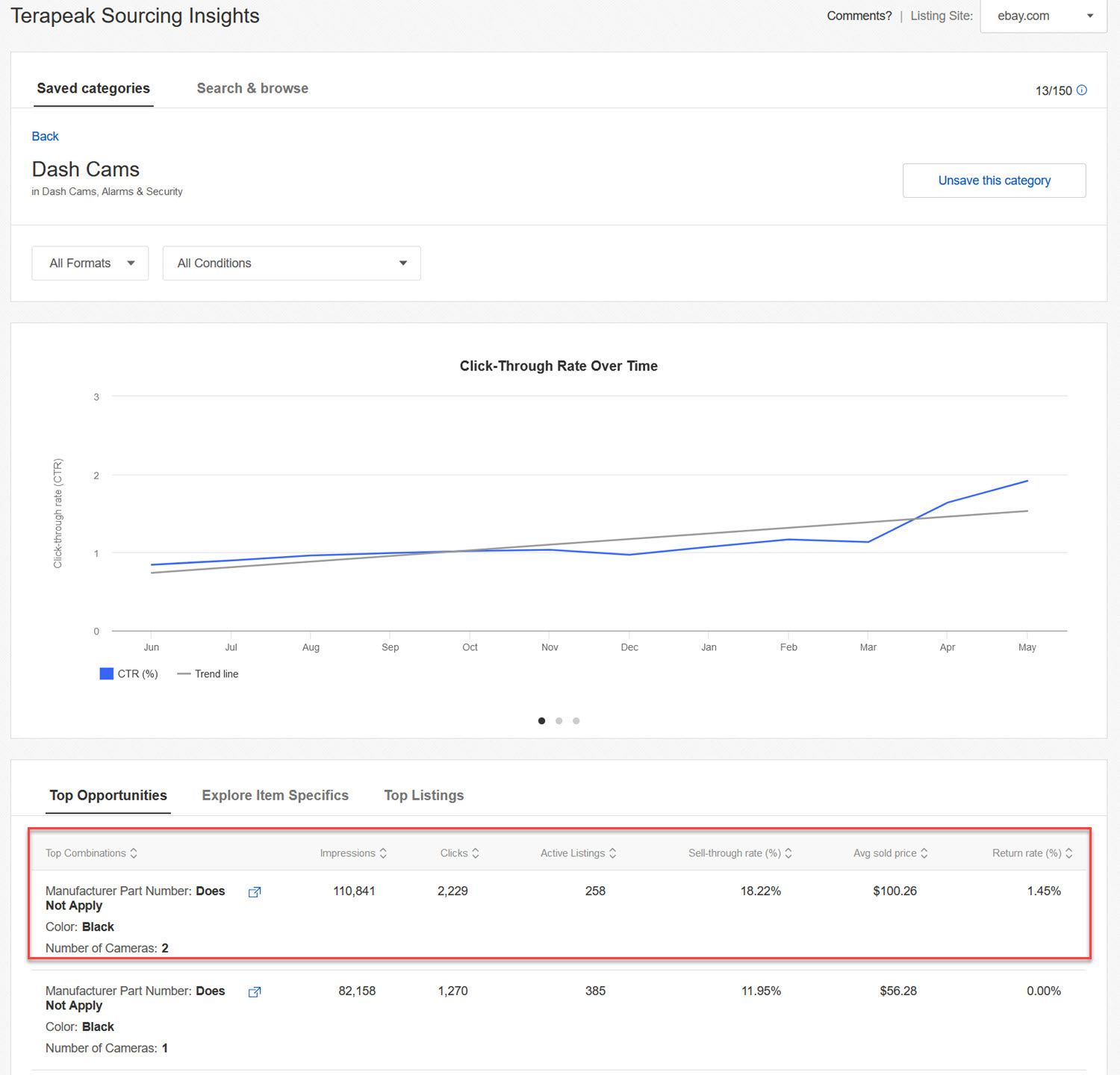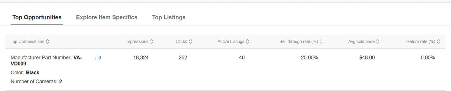 For example, the Dash Cams category shows a top opportunity with Manufacturer Part Number: Does Not Apply, Color: Black, and Number of Cameras: 2