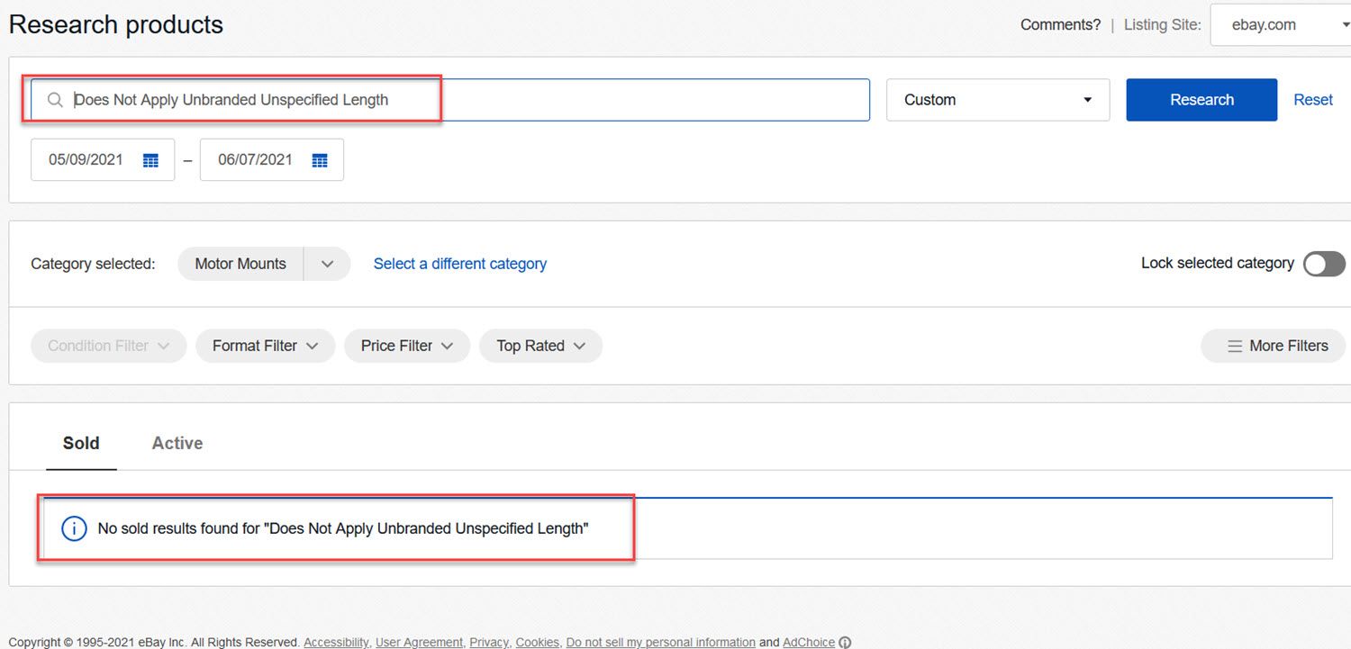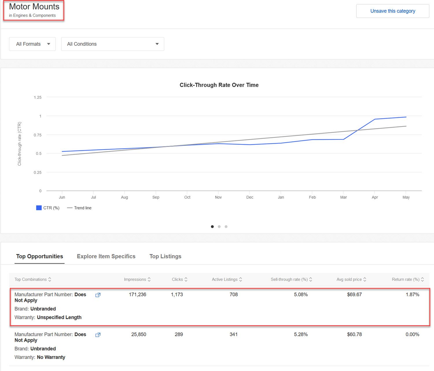 The Motor Mounts category shows even further issues with Item Specifics and different data in Terapeak Sourcing Insights vs. Terapeak Research.