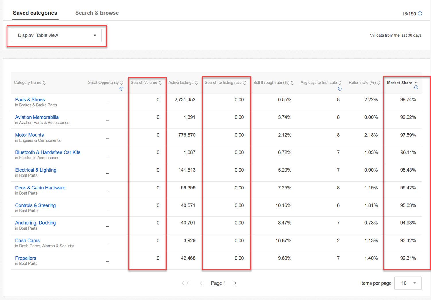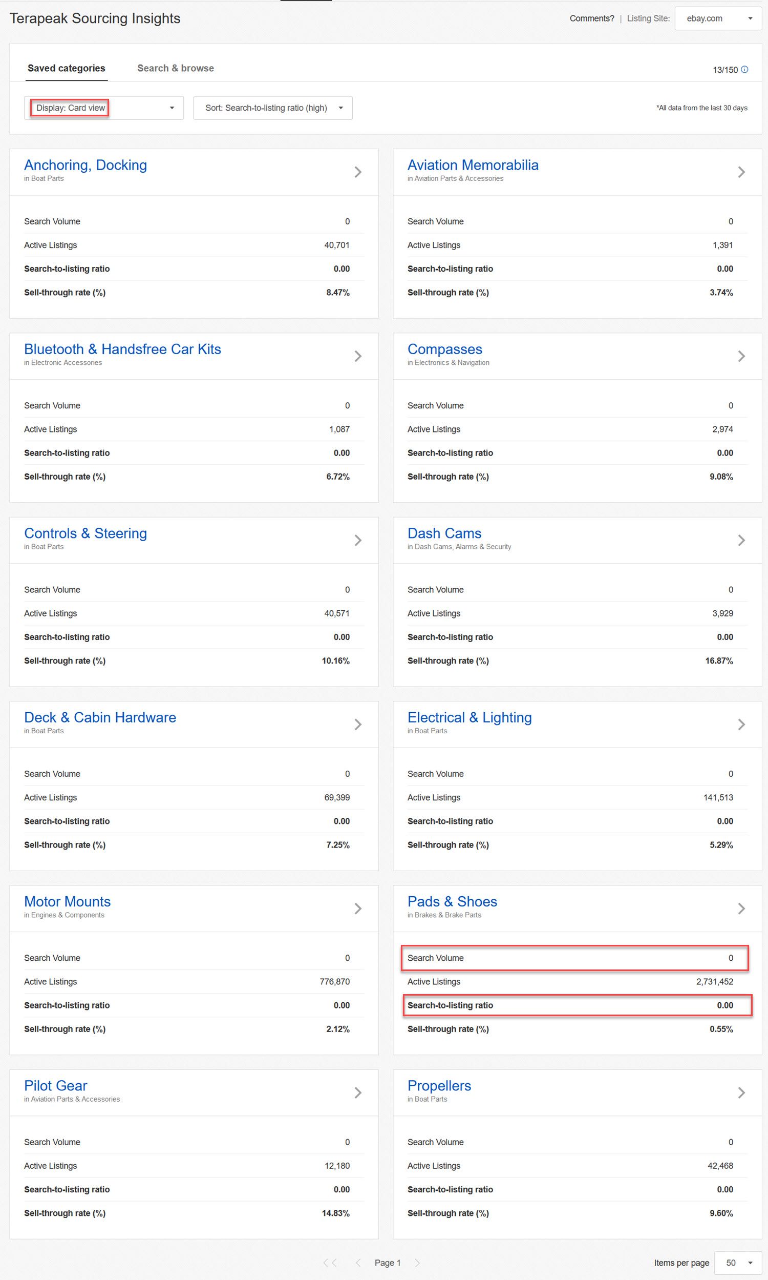 I added a variety of Motors sub-categories to test, but all of them are showing 0 search volume and 0.0 search-to-listing ratio. This has to be a technical problem or data error - with over 2.7 million listings for Brake Pads & Shoes for example, I don't believe it's possible no one is searching for those items on eBay.