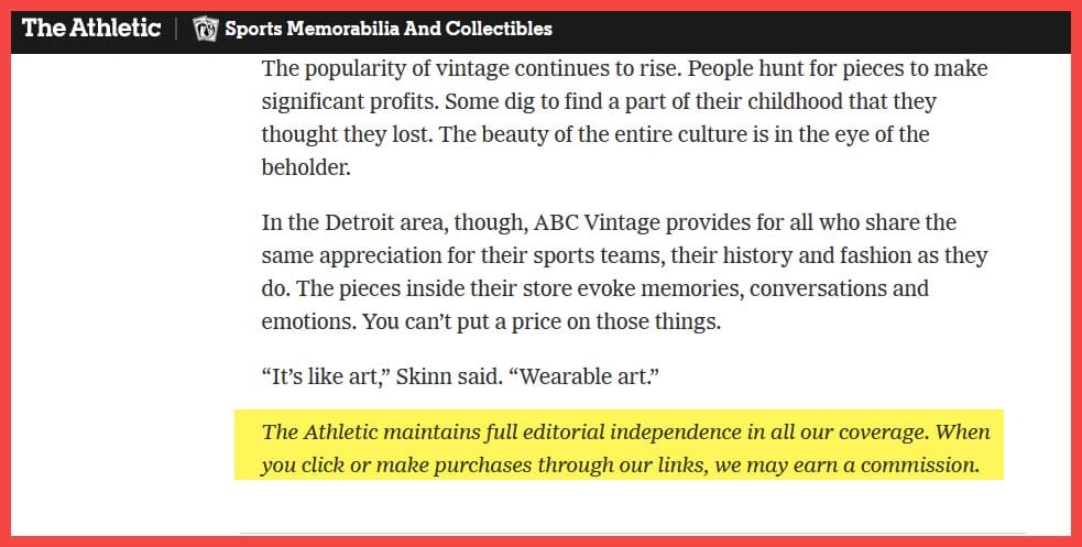 While there is a general disclaimer at the bottom that The Athletic may earn commissions from links in their articles, the initial press release makes it very clear this partnership with eBay includes much more than just affiliate commissions - a fact that is not disclosed anywhere directly on article pages.