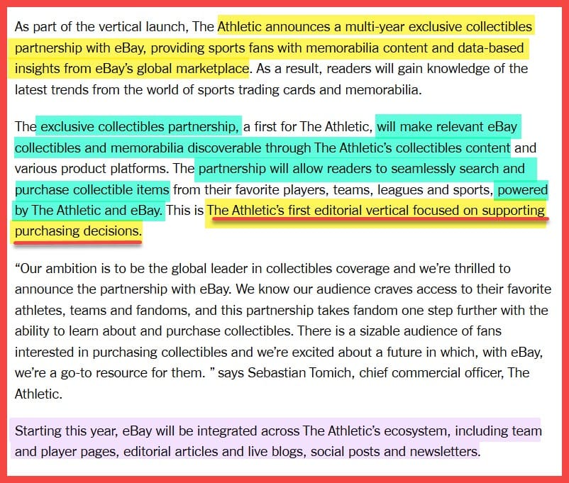 eBay signs multi-year deal with New York Times-owned The Athletic to provide exclusive sports trading card and memorabilia content, prompting reader skepticism and questions about journalistic integrity and ethics.