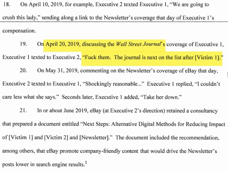 Court documents in the ongoing cases revealed details of eBay's troubled past with independent media publishers, including ex-CEO Devin Wenig and ex-Communications Chief Steve Wymer hiring a consulting firm that recommended creating and promoting company-friendly content in an effort to push coverage they didn't like down in search results.