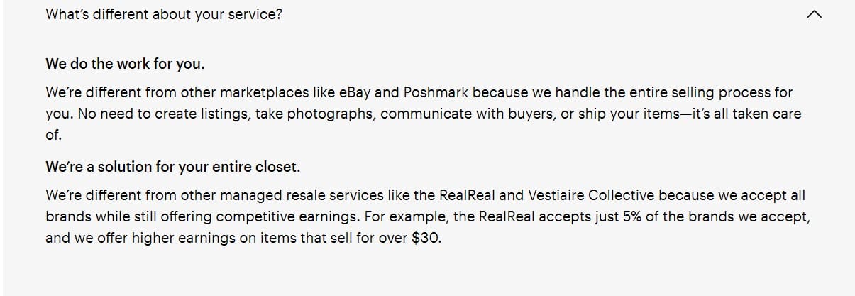 Traditionally, ThredUp has set itself apart from sites like Poshmark and eBay with it's "done for you" managed resale model.