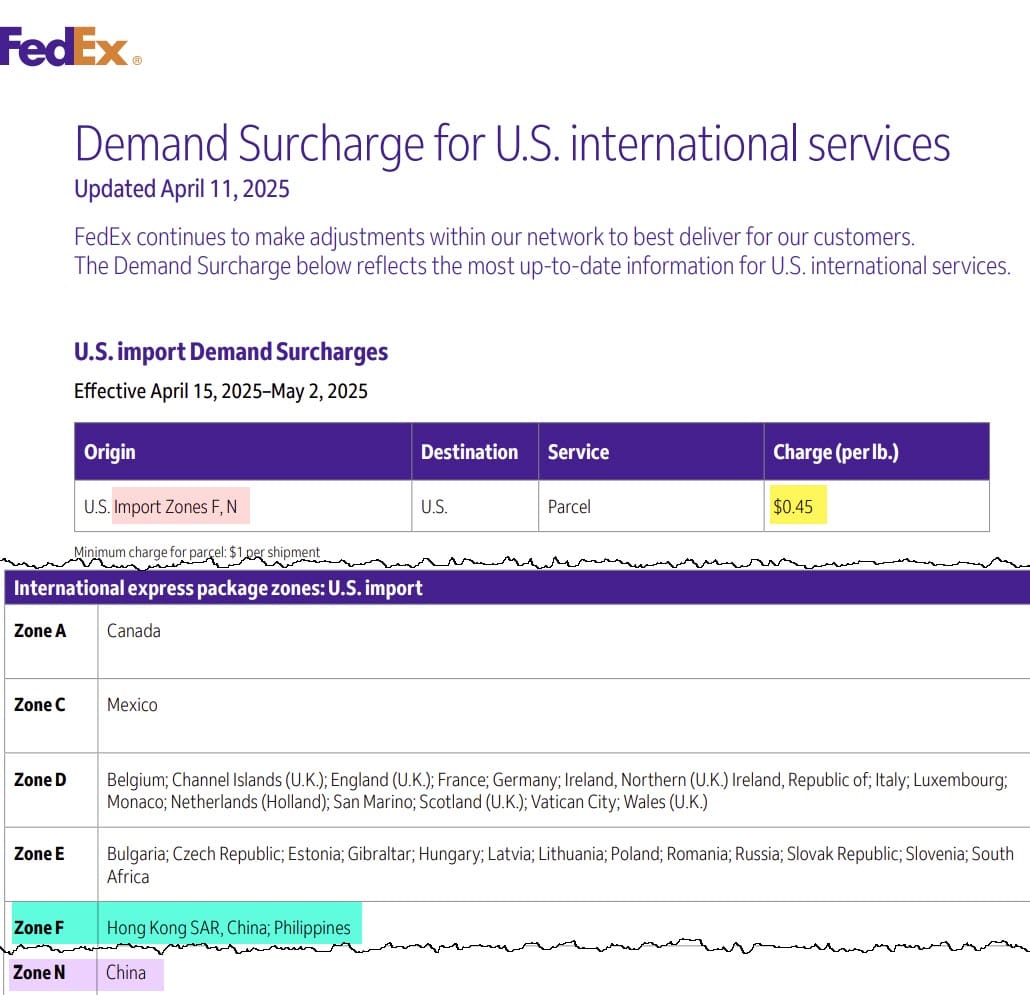 FedEx implemented a $0.45 per pound demand surcharge for US parcel imports from Hong Kong, the Philippines and China from April 15 - May 2.