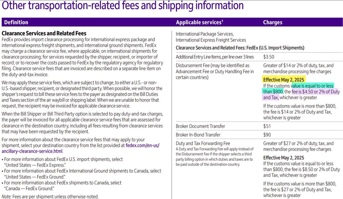 Starting May 2, 2025, FedEx shipments imported into the U.S. with a customs value of $800 or less will begin seeing a Disbursement Fee of $4.50 or 2% of duty and tax, whichever is greater, per the company’s service guide.