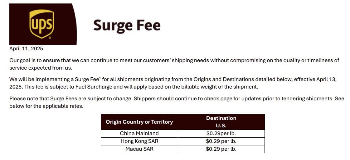 UPS reinstated its surge fee of $0.29 per pound for US parcel imports from China, Hong Kong and Macau effective April 13 with no end date.