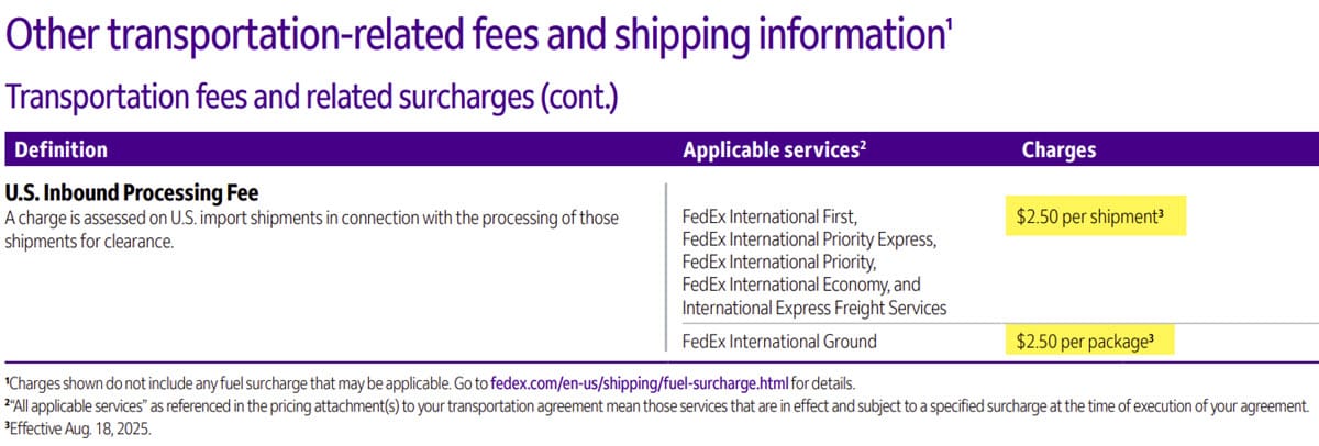 FedEx took a preemptive approach, increasing their international processing fee from $1.50 to $2.50 on August 18th on packages shipped via International First, International Priority Express, International Priority, International Economy, International Express Freight, and International Ground services.