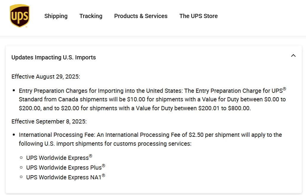 UPS will also be raising their fee to $2.50, effective September 8th on shipments coming into the US via Worldwide Express, Worldwide Express Plus, and Worldwide Express NA1 services.