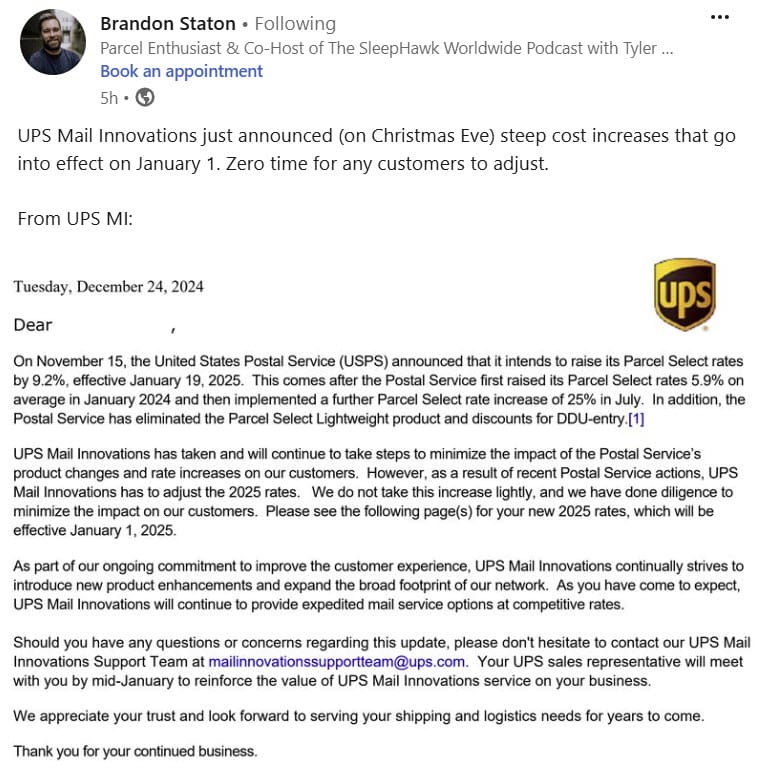 UPS has dropped a big Christmas Eve surprise, notifying shippers who use their Mail Innovations service that rates will be increasing by ~25% on January 1st.