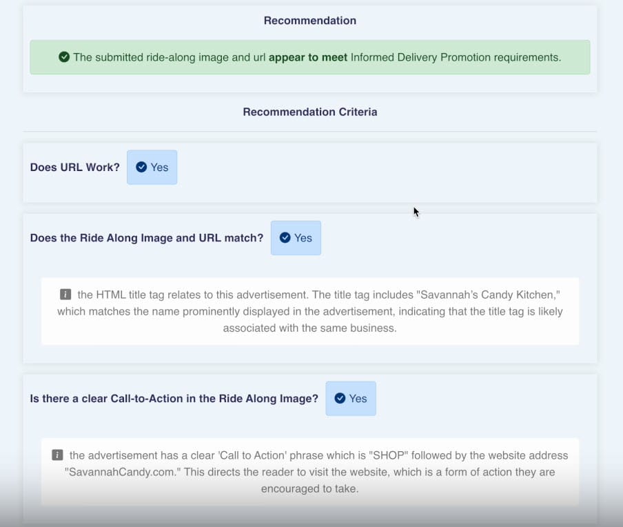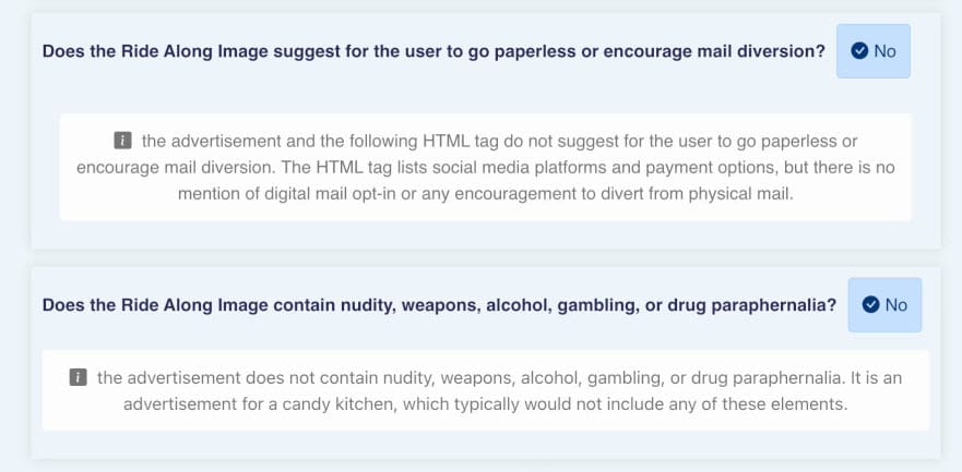 The video posted on PostalPro today shows examples of AI checking ad images and links for compliance.