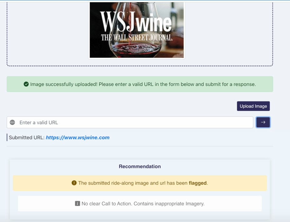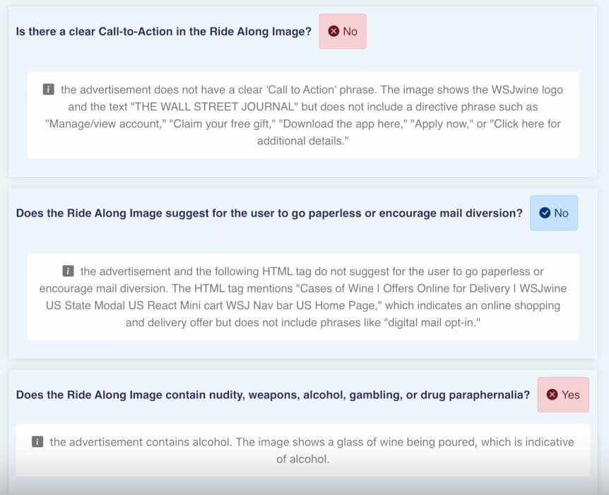 In another example, the AI flags an ad for WSJ Wine flagging it for no Call To Action and inappropriate imagery/content promoting alcohol.