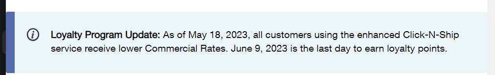 Loyalty Program Update: As of May 18, 2023, all customers using the enhanced Click-N-Ship service receive lower Commercial Rates. June 9, 2023 is the last day to earn loyalty points.