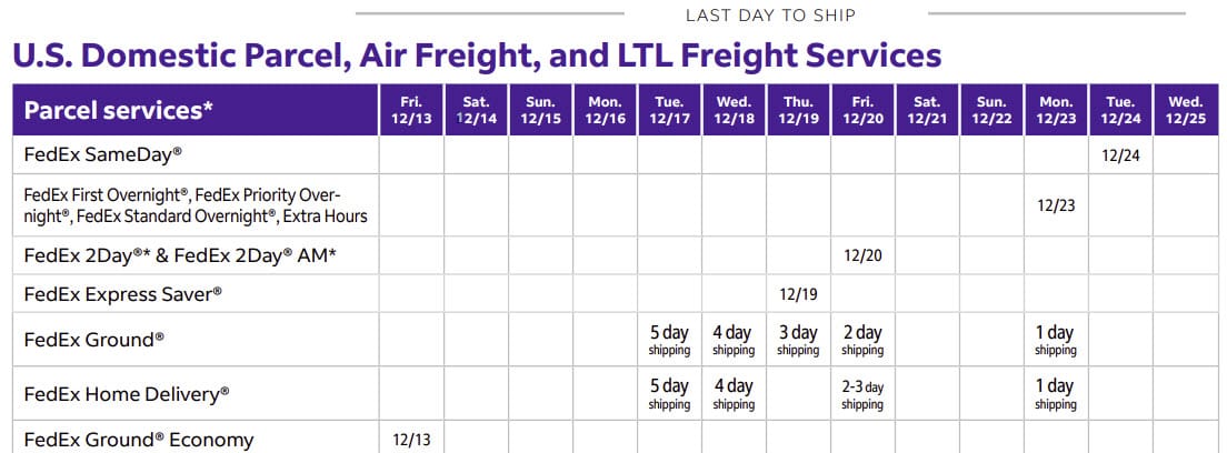 For freight, international and other services, check the complete list of FedEx holiday shipping deadlines: https://www.fedex.com/en-us/holiday/last-days-to-ship.html